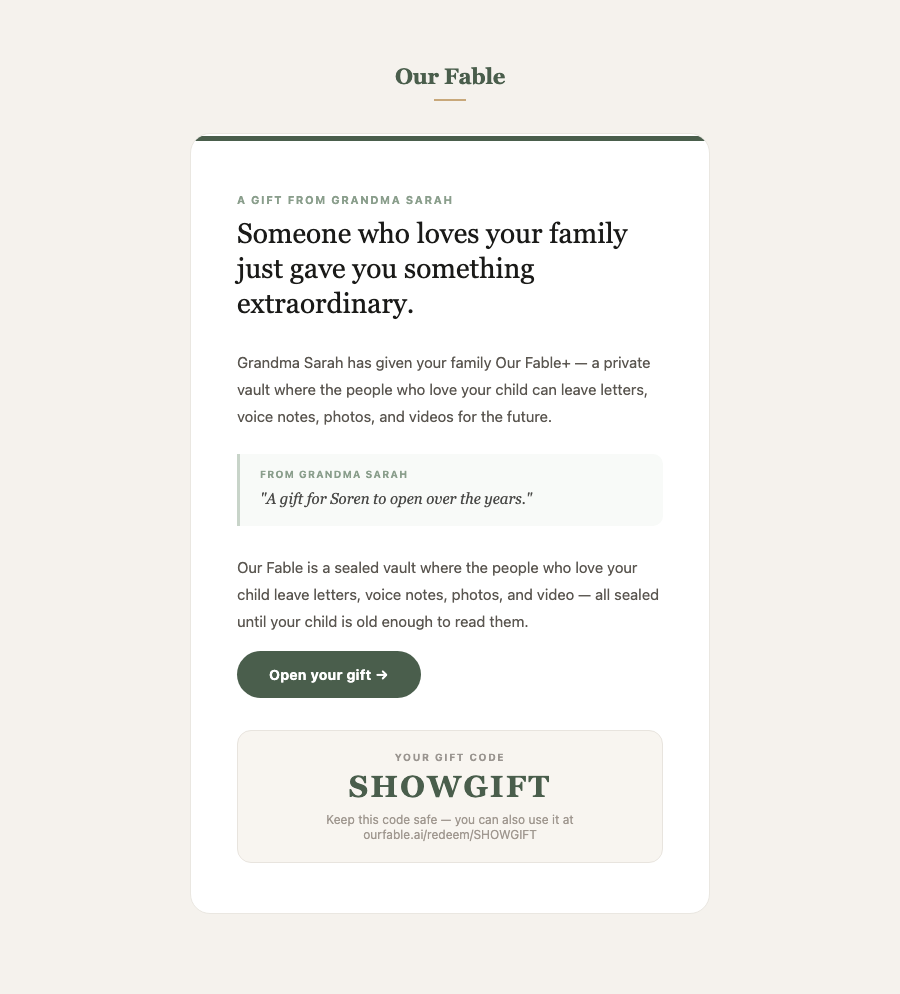 - 02Gift email preview · https://ourfable.ai/landing-artifacts/gift-email-preview.png