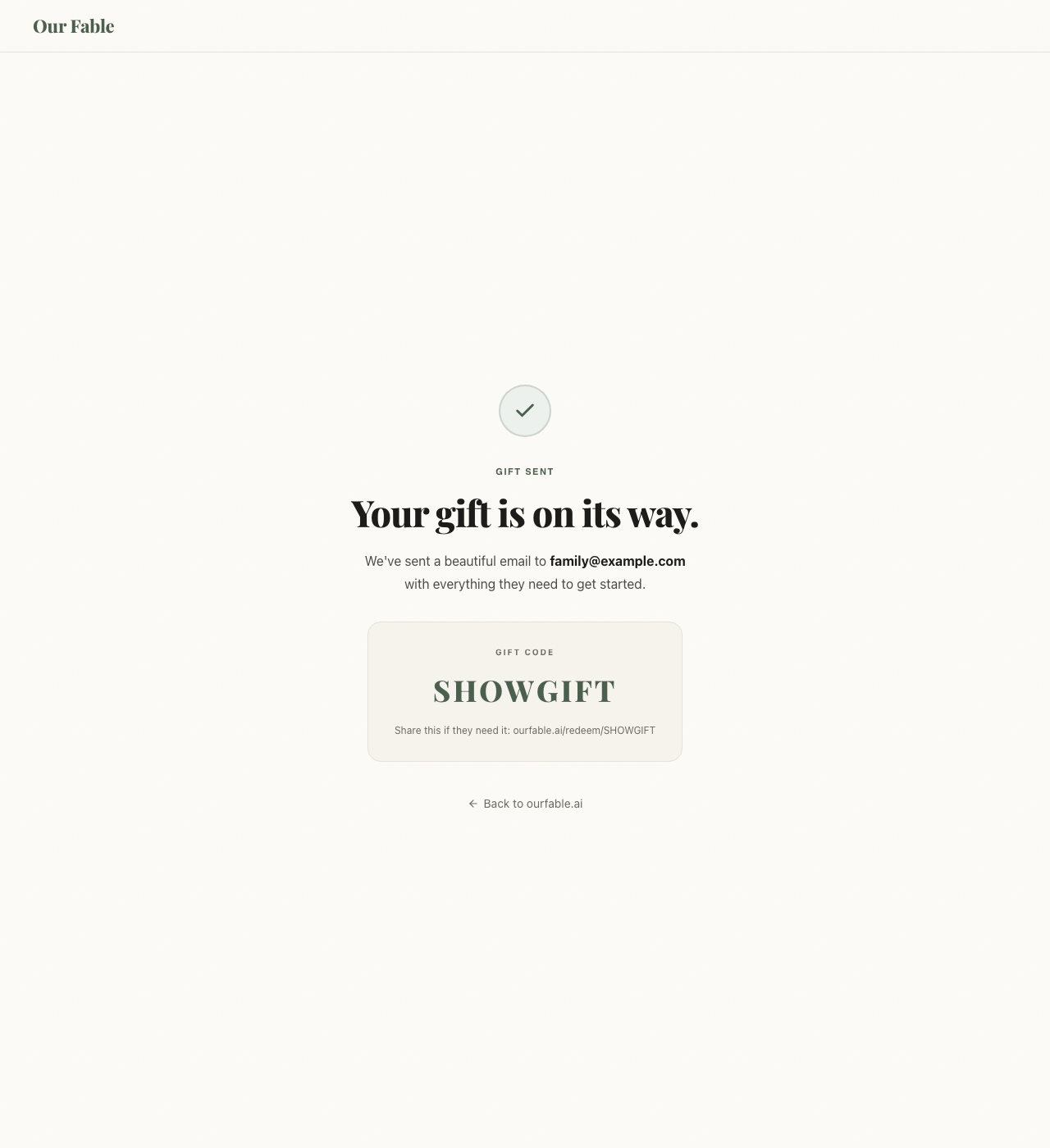 - 04Gift success screen · https://ourfable.ai/landing-artifacts/gift-success.png