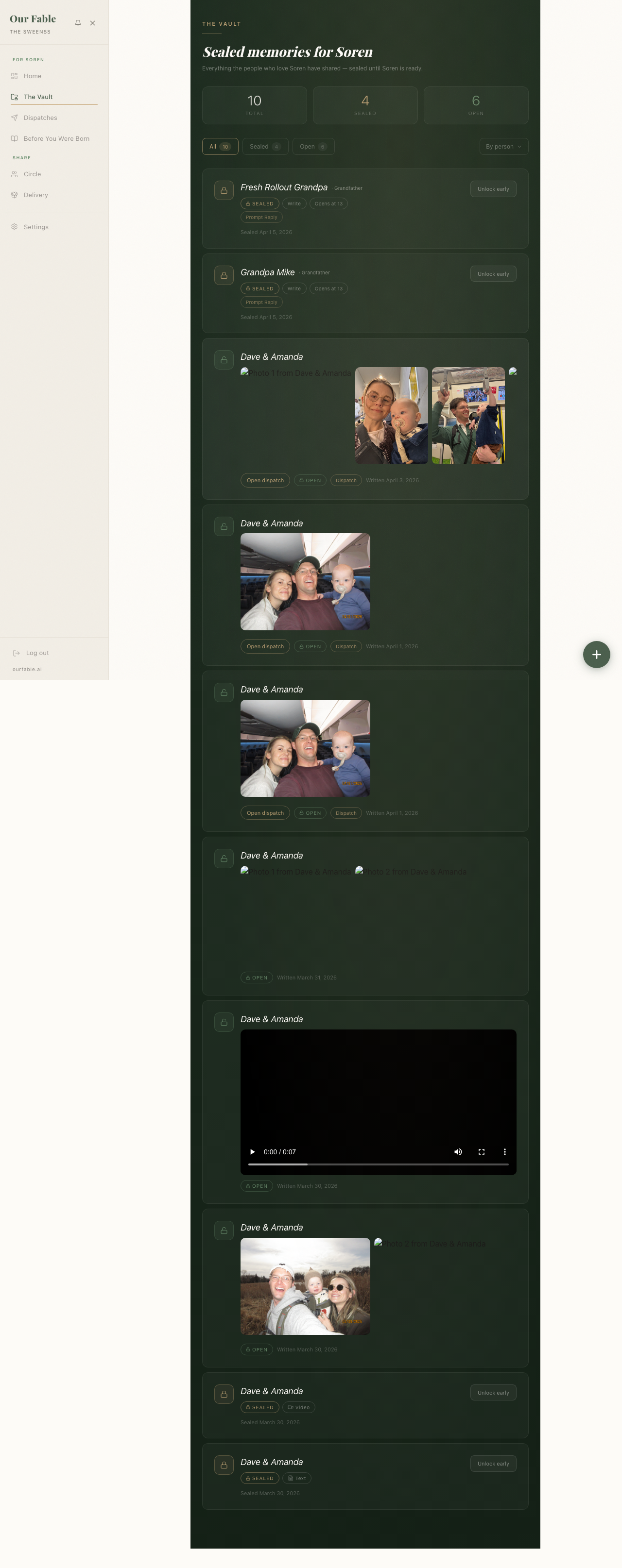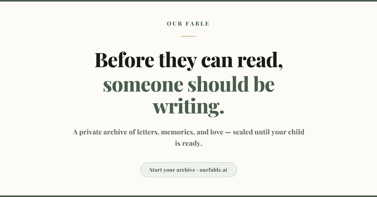 Our Fable is a private family memory archive for letters, voice notes, photos, and videos from the people who love a child, held for future milestone openings.